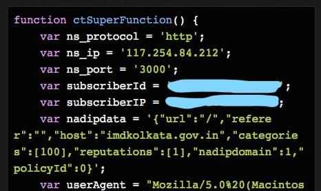 The script seems to indicate that a host of information is being shared, presumably with a third party advertiser, including not only details about the website being visited, but also information that could potentially identify the user. For example, the user’s IP address is being shared, while the variable subscriberId would indicate that some sort of alphanumeric identifier (that would presumably be unique to a user) is also being shared. Now, generally, when user data is shared with advertisers, it is done so in an aggregated manner that does not allow the advertiser to directly see who these users are. However, on the basis of the code above, it would seem like BSNL is sharing non-aggregated browsing data directly!