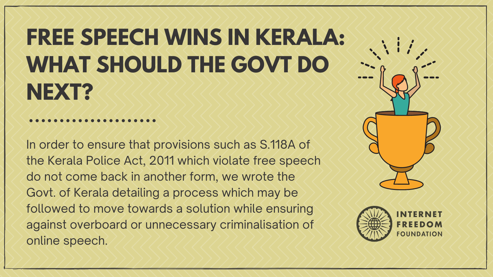 The decision of the Government of Kerala to repeal S.118A of the Kerala Police Act, 2011 is an emphatic win for civil society groups who vehemently opposed the provision by highlighting the free speech risks it posed. Local groups such as the Women in Cinema Collective (WCC) and local press were instrumental in ensuring that the Government was aware of the will of the people and their sustained opposition to the provision. Here, it is also pertinent to mention the close to 8 petitions that were filed against the provision in the High Court of Kerala. This shows that a vibrant and active civil society is essential to ensure that digital rights of the citizens of India are protected and upheld.