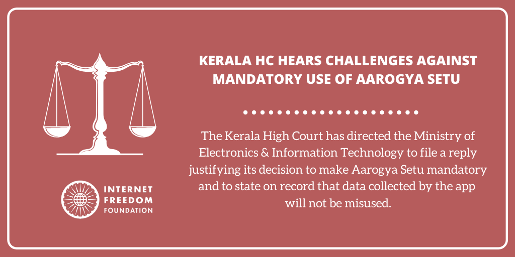 Today, the Kerala High Court heard two petitions challenging mandatory use of the Aarogya Setu app. The app was made mandatory for all public and private sector employees by the Ministry of Home Affairs through guidelines issued to States/Union Territories under the Disaster Management Act, 2005. IFF provided legal assistance for the petition filed by Jackson Mathew, Managing Partner of Leetha Industries which was accompanied by an expert affidavit by Professor Subhashis Banerjee from IIT Delhi. During the hearings, the Kerala High Court directed the Ministry of Electronics and Information Technology to file a reply and to state on record that data collected by the app will not be misused. The petitions are listed next on 18 May.