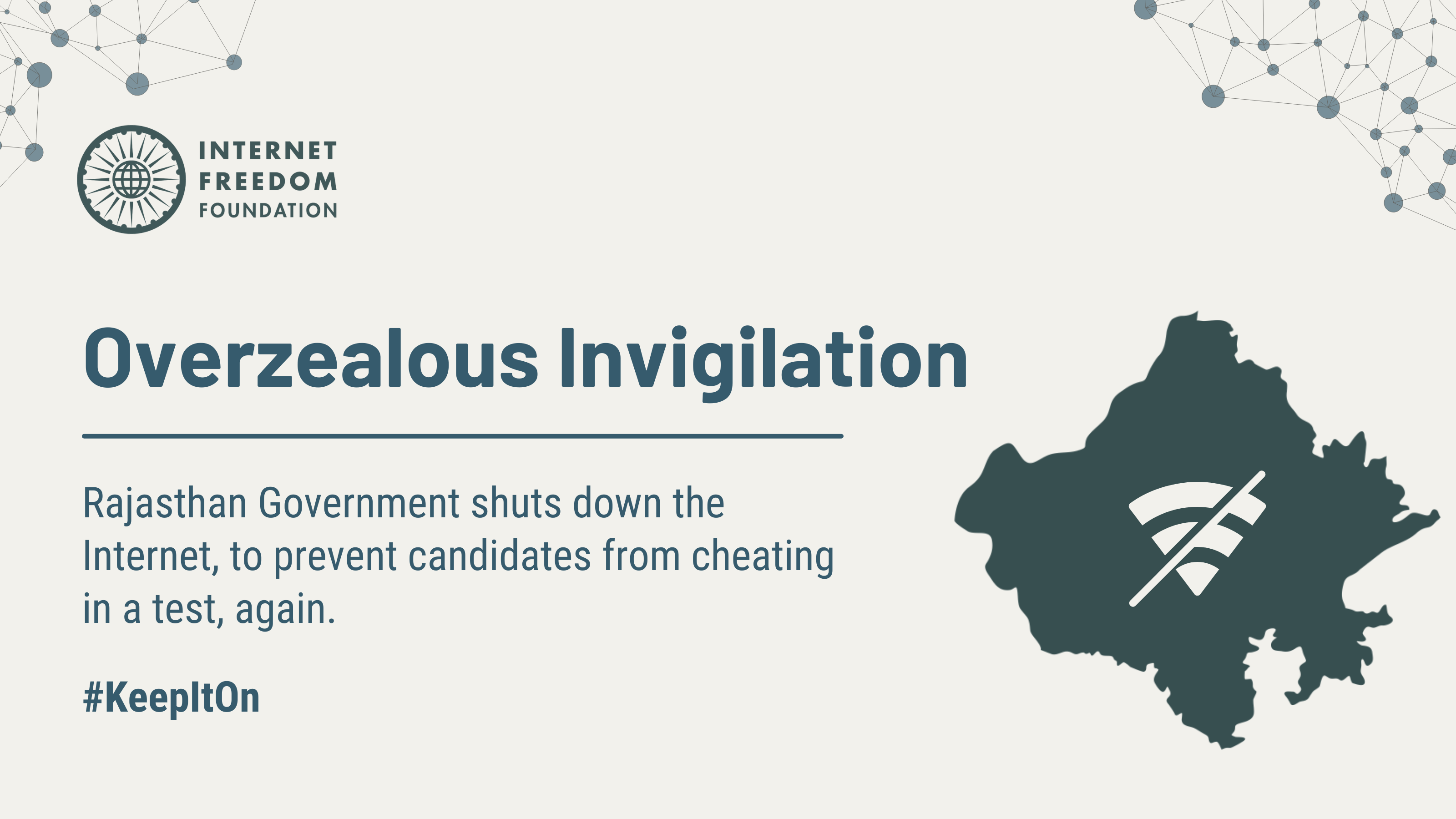 Access to information via the internet is a fundamental right under the Indian Constitution, and any restriction on internet access must be temporary, limited in scope, lawful, necessary and proportionate. Suspension of the internet, which causes huge economic loss and disruption in day-to-day livelihood of small businesses, to prevent cheating is not only highly disproportionate but also ineffective in curbing the menace of cheating. IFF stands against such internet shutdowns and we have urged the officers of the Rajasthan Government to: