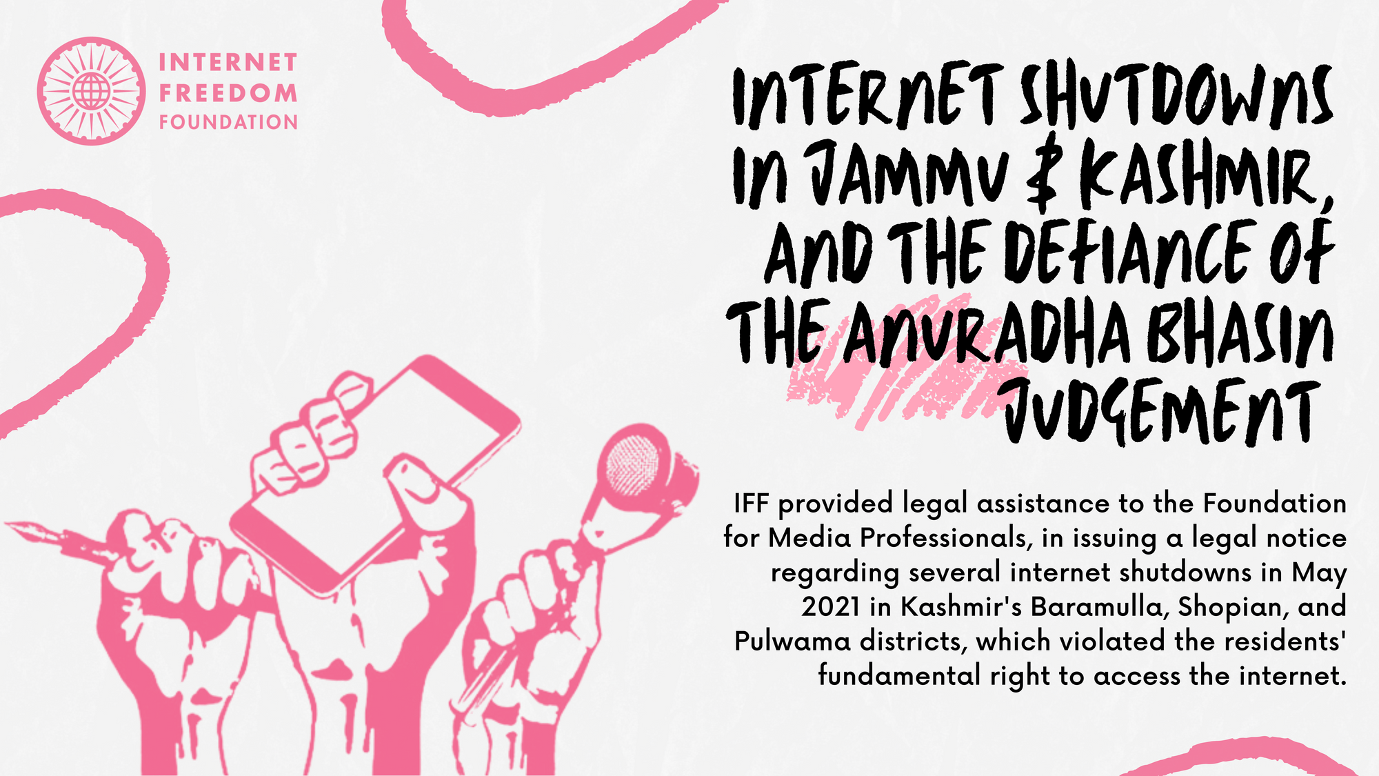 In May 2021 the Government of J&K suspended internet services on three occasions, without promptly publishing suspensions orders. Foundation of Media Professionals has addressed a legal notice to the Government of J&K asking them to comply with directions of the Supreme Court in Anuradha Bhasin.