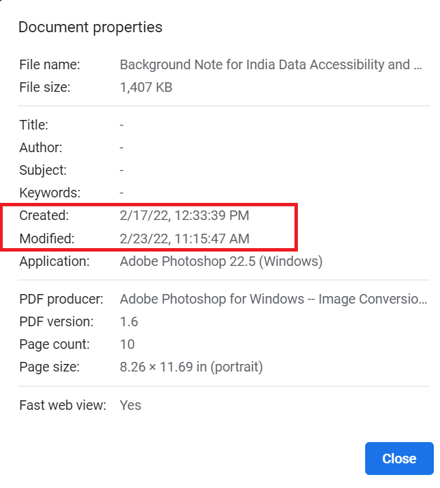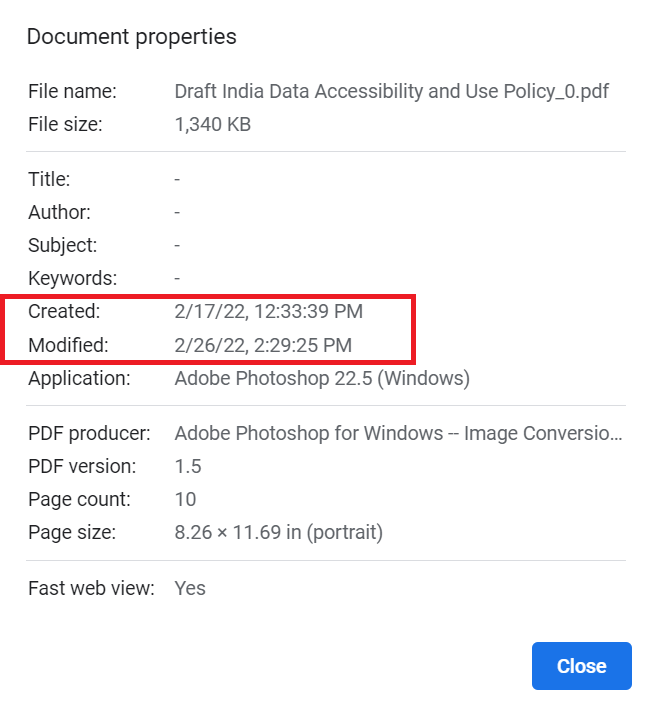 We submitted our comments to MeitY on March 4, 2022. To our great surprise, on March 6, 2022, we noticed that MeitY had made substantial changes to their webpage for the Draft Data Access Policy consultation and the underlying policy documents. Upon further inspection, we observed that the metadata of the Background Note showed that the document was created on February 17, 2022, but modified on February 23, 2022. Similarly, the policy document was created on February 17, 2022, and modified on February 26, 2022.